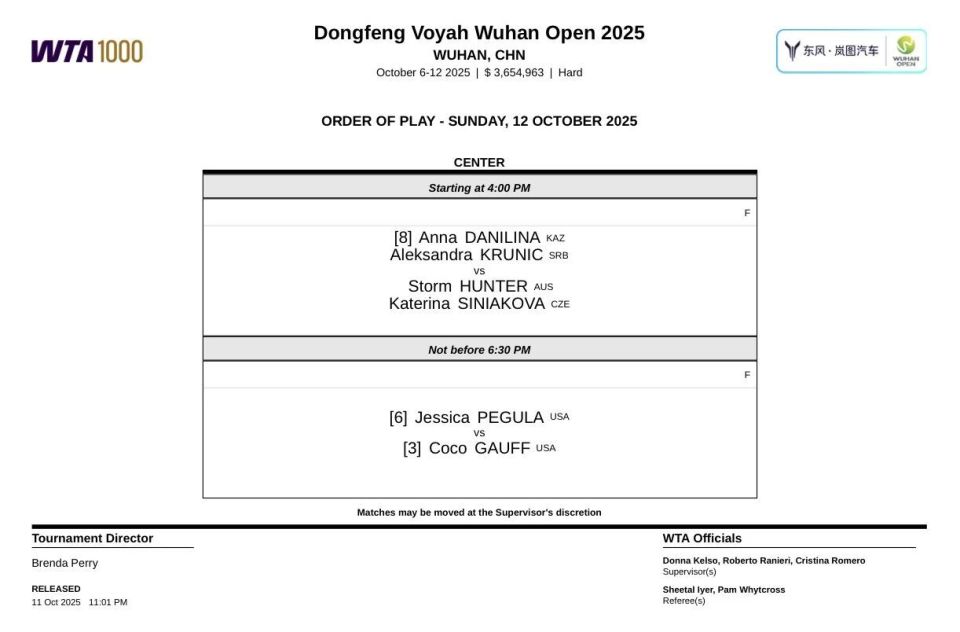 北京时间10月11日,2025武汉网球公开赛结束半决赛日的争夺,6号种子佩古拉险胜头号种子萨巴伦卡,3号种子高芙两盘击败7号种子泡利尼,“美国双姝”会师女单决赛。